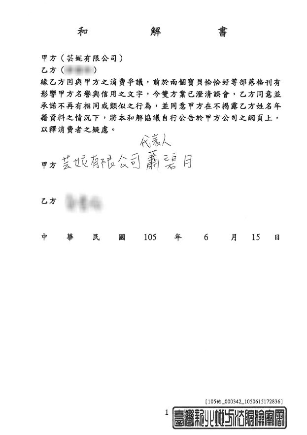 緣乙方因與甲方之消費爭議,前於兩個寶貝恰恰好等部落格刊有影響甲方名譽與信用之文字,今雙方業已澄清誤會,乙方同意並承諾絕不再有相同或類似之行為,並同意甲方在不揭露乙方姓名年籍資料之情況下,將本和解協議自行公告於甲方公司之網頁上,以釋消費者之疑慮。」
