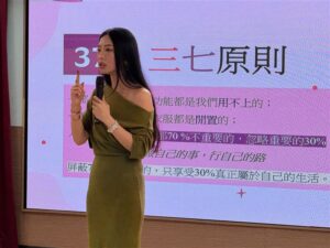 愛妮雅化妝品集團總裁特助陳子瑜,也親自為員工帶來心態管理課程。一開場,她首先提到:「別在乎70%不重要的事,專注在30%真正屬於自己的生活。」她強調不要過度在意他人閒言閒語,更表示:「誰不會被人講?如果每個都要在乎,就太浪費心力。」她也提醒員工要培養「屏蔽力」,學會排除負面與無效訊息,以及抵禦他人評價與情緒的能力。