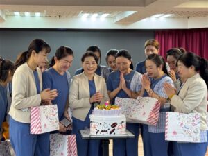 愛妮雅化妝品集團業務部總經理蕭榮利致詞時表示,林口店已連續44個月達成單月百萬業績,桃竹苗區的員工更是每月薪資超過15萬元。他也建議員工,有錢先買房、再買車,信心喊話希望員工業績蒸蒸日上。